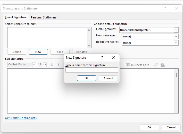 4. Veljið undirskriftina sem búin var til (valkvæða heitið) með því að smella á hana. Afritaða efnið úr Wordskjalinu er síðan límt í reitinn fyrir neðan (Edit signature) og persónuupplýsingar settar á viðkomandi stað.