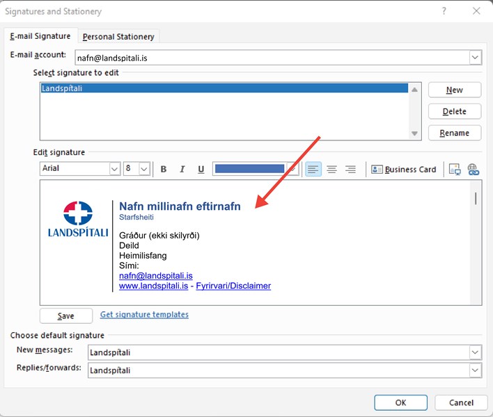 Hér er í Wordskjali formið á undirskrift eins og hún á að líta út í tölvupósti Landspítala (word skjal)