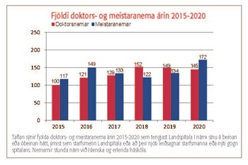 Landspítali er einn stærsti vinnuveitandi fólks með doktorspróf á landinu. Þetta er starfsfólk sem hefur varið mörgum árum af ævi sinni í þjálfun til vísindarannsókna og margir brenna fyrir nýsköpun og rannsóknum. Mikilvægt er að því sé skapaður vettvangur til að halda áfram að vinna að rannsóknum meðfram klínískum störfum eftir að doktorsnámi lýkur. Það er sjúklingum og heilbrigðiskerfinu öllu til hagsbóta auk þess sem það viðheldur rannsóknarmenningu og elur upp framtíðarvísindamenn. Það vekur því áhyggjur að nokkur fækkun varð á birtingum vísindagreina í hópi starfsmanna spítalans á árinu 2020, einkum í erlendum vísindatímaritum og nam fækkunin tæpum 6% samanborið við árin á undan, mynd 1. Þessi niðurstaða er vonbrigði því hún gengur þvert á þau markmið sem spítalinn hefur sett sér, t.d. með starfsáætlun og vísindastefnu spítalans 2019-2024. Vert er að árétta að sú stefna gengur m.a. út á að auka fjárframlög til rannsókna og nýsköpunar. Fjölda leyfa sem siðanefndir veittu starfsmönnum spítalans fyrir nýjum vísindarannsóknum má sjá á mynd 2. Eins og sjá má á myndinni var fjöldi þeirra leyfa sem vísindasiðanefnd gaf út óbreyttur samanborið við fyrri ár en fækkun varð um nærri fjórðung í fjölda veittra leyfa frá siðanefnd heilbrigðisrannsókna á spítalanum. Líta má að fjölda umsókna og veittra leyfa sem sterka vísbendingu um rannsóknaráform til framtíðar og því er þessi fækkun áhyggjuefni og kallar á nánari skoðun. Er ástæðan of mikið álag á þá starfsmenn sem hefðu áhuga á að stunda rannsóknir eða fer virkum vísindamönnum á spítalanum fækkandi? Sams konar viðvörunarmerki má sjá þegar fjöldi umsókna um styrki úr vísindasjóði spítalans er skoðaður. Ef möguleikar starfsmanna til að sinna þessu mikilvæga hlutverki fer dvínandi boðar það ekki gott fyrir framtíð íslenskrar heilbrigðisþjónustu, enda fara rannsóknir, menntun og gæði klínískrar þjónustu saman. Jafnvel þótt öflugt og metnaðarfullt fagfólk sé til staðar þarf fullnægjandi fjármögnun og tími til rannsóknastarfsins að koma til. Á mynd 3 má sjá samantekt á upphæðum þeirra vísindastyrkja sem starfsmenn Landspítala hafa aflað undanfarin sex ár. Á árinu 2020 var heildarupphæðin óbreytt frá árinu áður, - vel á fimmta hundrað milljóna króna var aflað alls. Styrkir erlendis frá drógust hins vegar saman en innlendir styrkir jukust að sama skapi. Ráðstöfunarupphæð vísindasjóðs Landspítala var óbreytt. Á árinu 2019 var samþykkt vísindastefna fyrir Landspítala þar sem fram kom að stefnt skuli að því að því að 3% af veltu renni til vísindastarfs árið 2024. Þetta hóflega markmið er hið sama og samþykkt var árið 2007 en efndir urðu engar í það skiptið. Nú er gerð önnur tilraun. Forsenda þess að við náum settu marki er að vísindahlutvert spítalans sé fjármagnað sérstaklega. Tíminn leiðir í ljós hvort efndir verða betri nú. Mikilvægi Landspítala sem kennslustofnunar má glögglega sjá á mynd 4, en hún sýnir fjölda meistara- og doktorsnema sem stunda nám sitt að hluta eða heild á spítalanum. Allar þessar tölur minna á mikilvægi spítalans fyrir vísindarannsóknir, mönnun og nýliðun heilbrigðiskerfisins til framtíðar. Sagnfræðingar þreytast ekki á að benda á að framfarir eigi sér oft stað í kreppum og að þær séu ekki línulegar heldur komi þær í stökkum. Það sama gildir hins vegar um afturför, hún er sjaldnast línuleg eða algerlega fyrirsjáanleg. Vonandi endurspegla þessar tölur fyrir árið 2020 tímabundið álag fremur en afturför. Mikilvægi rannsókna og gagnreyndar þekkingar hefur líklega aldrei verið almenningi og ráðamönnum ljósara en nú.