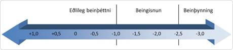 Myndin sýnir skilin milli eðlilegs beinmassa, beingisnunar og beinþynningar samkvæmt T-gildum.