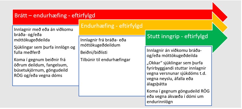 Innlagnarferli á legudeildir RÖG getur verið ólíkt og veltur á aðstæðum hverju sinni. Sjúklingar deildanna leggjast ýmist inn frá öðrum deildum Landspítala, stofnunum eða samkvæmt tilmælum dómstóla. Ef aukinna sjúkdómseinkenna verður vart við eftirfylgni á göngudeild geta meðferðaraðilar farið fram á endurinnlögn á legudeildir. Yfirlæknir og deildarstjóri sjá um að stýra flæði sjúklinga.