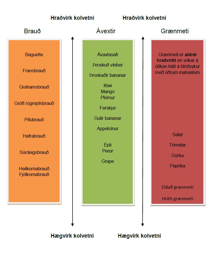 Í dæminu hér að ofan hefur blóðsykur hækkað hratt eftir kolvetnaríkan morgunverð og afleiðingin er mikil hækkun. Á línuritinu sést líka hvernig blóðsykur hækkar seint að deginum eftir fituríkan hádegisverð. Það gerist vegna þess að fitan tefur fyrir frásogi kolvetna.