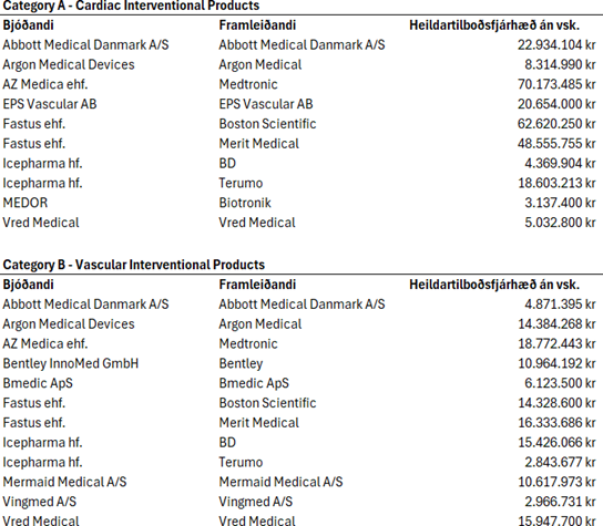 Það tilkynnist hér með að tilboð Alvogen ehf / Zentiva k.s., Icepharma / Aspen Pharma LTD, Icepharma / LYFIS / KRKA, d.d., Novo mesto, Icepharma / Pfizer Europe MA EEIG, Icepharma / Viatris Limited, Vistor / AbbVie Deutschland GmbH & Co, KG, Vistor / Fresenius Kabi AB, Vistor / Novartis Healthcare, Vistor / Orion Corporation og Teva Pharma Iceland ehf / Teva B.V. hafa verið endanlega samþykkt og er því kominn á bindandi samningur milli aðila.