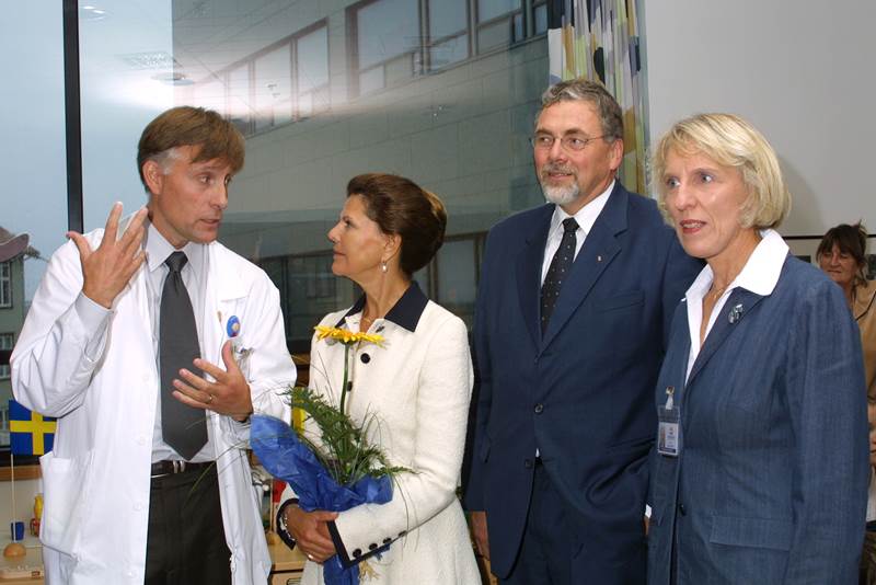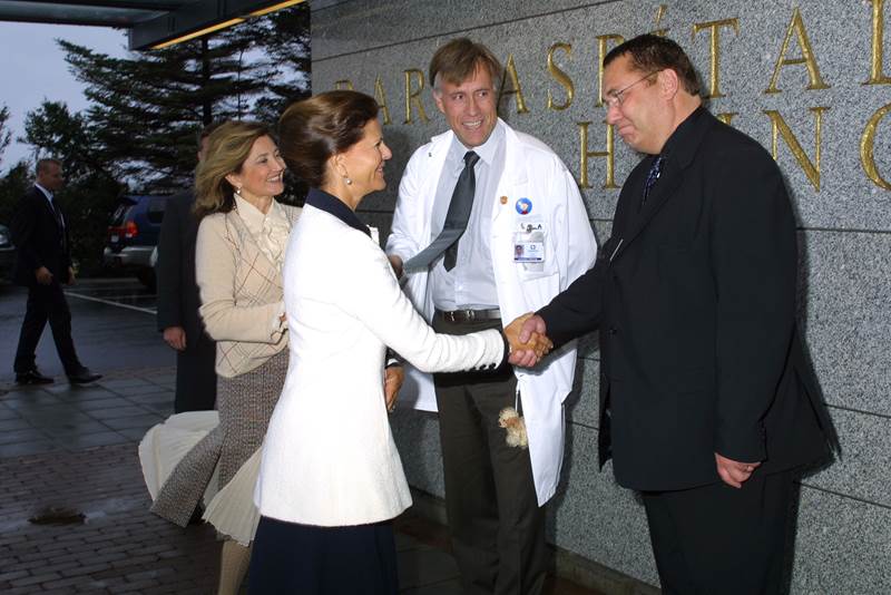 Sylvía Svíadrottning skoðaði Barnaspítala Hringsins í dag, á fyrsta degi opinberrar heimsóknar sænsku konungshjónanna og dóttur þeirra til Íslands. Dorrit Moussaieff forsetafrú var í för með drottningu og með þeim fjölmennt fylgdarlið aðstoðarmanna og fjölmiðlafólks. Jóhannes M. Gunnarsson forstjóri LSH, Anna Stefánsdóttir framkvæmdastjóri hjúkrunar og sviðsstjórar barnasviðs, Ásgeir Haraldsson og Magnús Ólafsson tóku á móti gestunum, gengu um húsið með þeim og sögðu frá starfseminni.