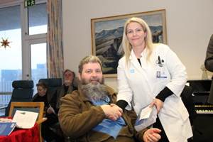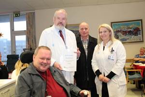 Forystumenn í MG félaginu og MND félaginu komu færandi hendi á aðventustund taugalækningadeildar B2 á Landspítala Fossvogi 19. desember 2012. Guðjón Sigurðsson (Gaui), formaður MND félagsins, og Pétur Ágústsson, formaður MG félagsins, afhentu þar formlega verkjadýnu sem er nú þegar komin í notkun og nýtist vel. Valur geislaskáld las auk þess ljóð úr bók sinni "Göngublá tilvera" og gaf deildinni nokkur eintök.