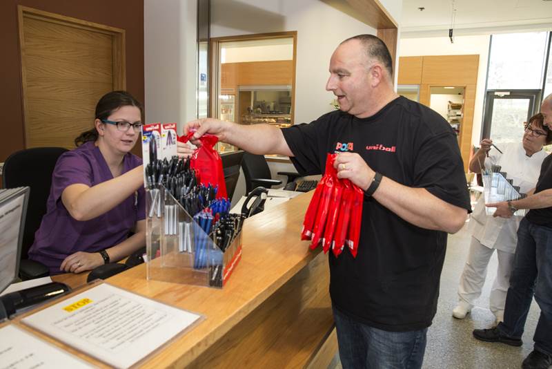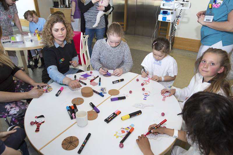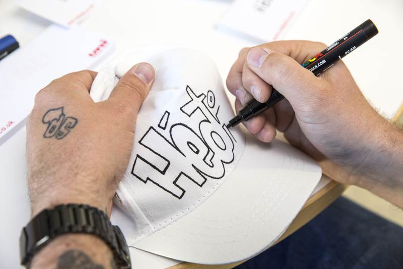Starfsfólk A4 á Íslandi og Uni Ball í Bretlandi kom færandi hendi á Barnaspítala Hringsins 19. maí 2017. Það gaf fjölskyldum og starfsfólki góða penna og götulistamaðurinn SPzero frá Bristol skrautskrifaði nöfn barnanna á hvítar derhúfur og færði þeim að gjöf.
