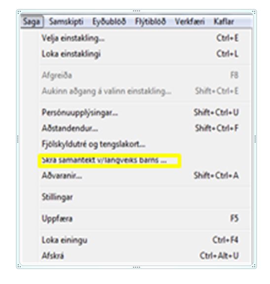 Þessi nýja síða, „Samantekt fyrir langveik börn“, hefur verið prófuð um nokkurt skeið og reynst mjög vel. Hún er aðgengileg öllum notendum Sögu og Heilsugáttar í heilbrigðiskerfinu. Mikilvægt er að kanna hvort sjúklingur á færslu undir þessum flipa (sjá myndir að neðan). Færslan er uppfærð af meðferðaraðilum og getur innihaldið mjög mikilvægar upplýsingar varðandi bráðameðferð. Þessi samantekt getur nýst öllum og auðvelt er að gera slíka fyrir sjúklinga. "Blað" sjúklings er búið til með því að opna flipann Saga efst til vinstri á skjánum (sjá mynd að neðan).