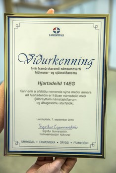 Á veturna eru að jafnaði um 1.800 nemar á ýmsum sviðum heilbrigðisvísinda við nám og störf hjá okkur. Það er mikilvægt að þessi hópur fái góða viðkynningu á spítalanum og deildir leggi sig fram við að taka vel á móti mögulegum framtíðarstarfskröftum. Við fylgjumst vandlega með því hvernig til tekst og þannig sendir til dæmis menntadeild rafræna könnun til hjúkrunar- og sjúkraliðanema eftir hvert klínískt námstímabil. Þá eru lagðar fyrir nokkrar spurningar sem meta ánægju nemenda með námstækifæri, aðstöðu á deildinni, ánægju með móttöku og fleira. Hjartadeild 14EG kemur einstaklega vel út í þessum könnunum, þrátt fyrir að taka á móti óvenjulega miklum fjölda nema ár hvert og segja nemendur til dæmis að deildin sé frábær námsdeild með fjölbreyttum námstækifærum og áhugasömu starfsfólki. Það var því ánægjustund þegar Sigríður Gunnarsdóttir, framkvæmdastjóri hjúkrunar veitti í vikunni hjartadeild 14EG viðurkenningu fyrir framúrskarandi námsumhverfi fyrir hjúkrunar- og sjúkraliðanema. Til hamingju 14EG!