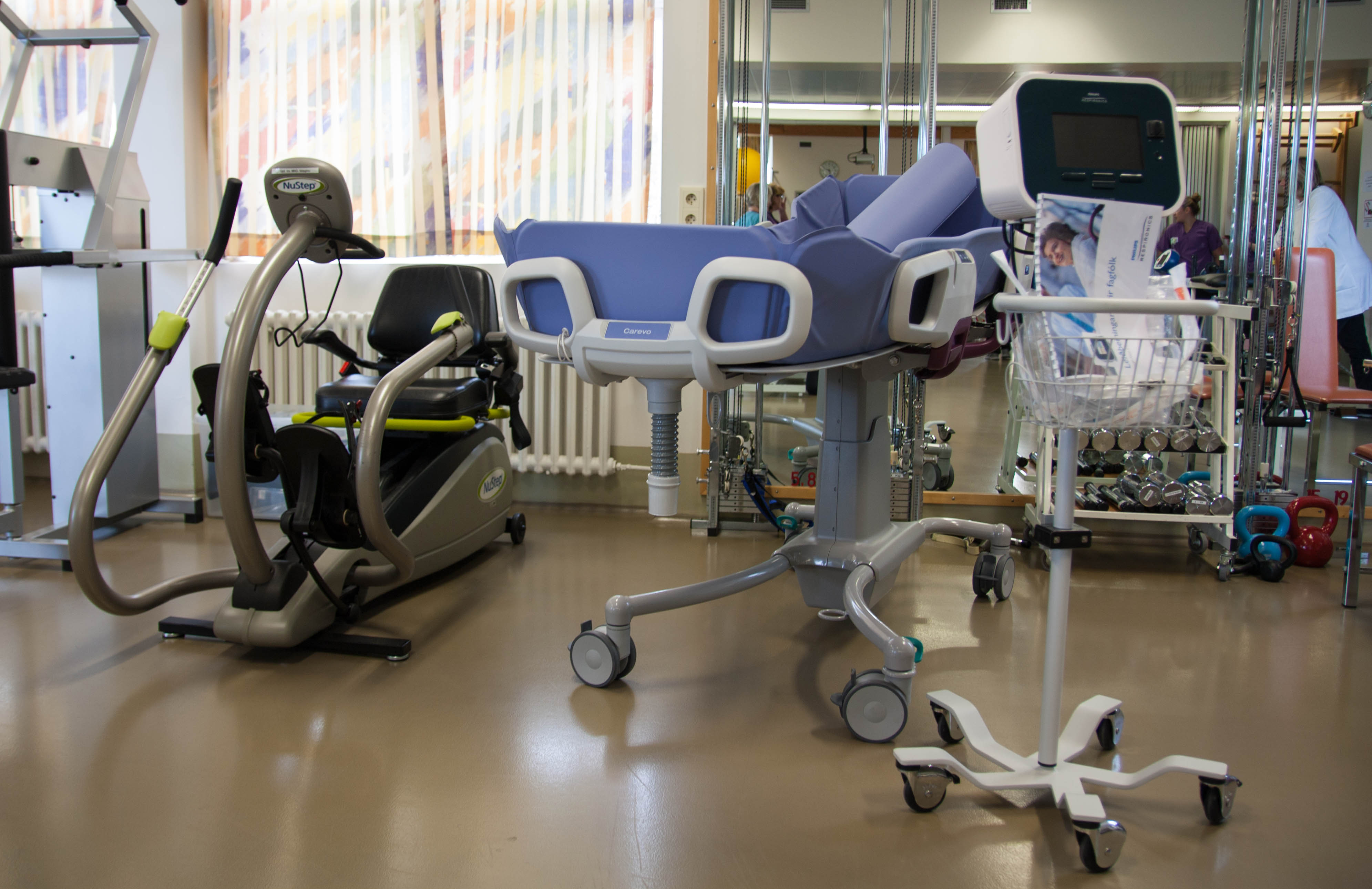 Tækin sem MND félagið gaf: Baðbekkur, hóstavél og T43 fjölþjálfi.