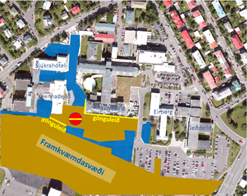 Gönguleið frá Barnaspítala er enn opin í austur, í átt að Geðdeild. Gangandi vegfarendur geta enn gengið upp við gamla spítala eins og meðfylgjandi mynd sýnir.