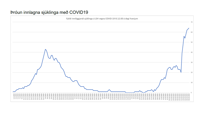 63 sjúklingar inniliggjandi vegna COVID19 – 127 alls frá upphafi III bylgju faraldursins