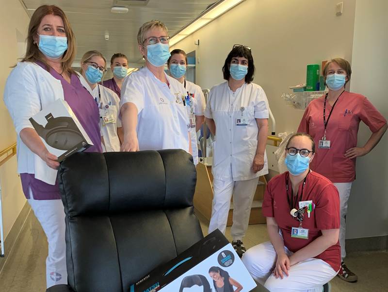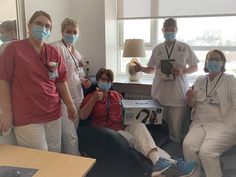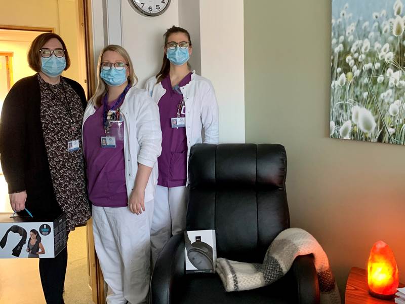 Tíu legudeildir í Fossvogi fengu rafknúinn hægindastóll, hjóðeinangrandi heyrnatól af bestu gerð, nuddtæki og þyngingarteppi, allt hugsað til að gera stutta hvíld og slökun aðgengilega á vaktinni og taka orkublundi á næturvaktinni.