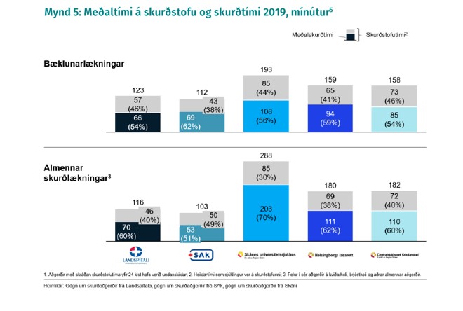 Þrátt fyrir þetta er staðreyndin sú að Landspítali stendur framar viðmiðunarsjúkrahúsum erlendis í framleiðni á skurðstofum og nýtingu þeirra. Þar munar raunar gríðarmiklu eins og sést skýrt á mynd 5 úr skýrslu McKinsey.