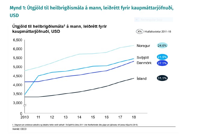 Mikilvægt er að leggja áherslu á það að góð leið til að bæta framleiðni er að vinna í ferlum og sérhæfa sig. Þessu höfum við náð á Landspítala sem hefur t.d. náð að fjölga skurðaðgerðum jafnt og þétt eða um 45% á síðustu 10 árum. Landspítali er þjóðarsjúkrahús Íslands og sinnir bæði sérhæfðu sjúkrahúshlutverki, héraðssjúkrahúshlutverki, hlutverki í viðbragði almannavarna (m.a. bráðamóttakan) auk þess að sinna lykilhlutverki í menntun heilbrigðisstétta og heilbrigðisrannsóknum. Ljóst er að þetta margþætta, mikilvæga hlutverk mun alltaf að einhverju leyti koma niður á framleiðni, sérstaklega þar sem spítalinn sinnir vissum sérhæfðum verkefnum, sem smæð þjóðarinnar leyfir vart. Þetta fjölþætta hlutverk gerir samanburð við sjúkrahús erlendis, sem t.d. geta hætt tiltekinni starfsemi til að efla framleiðni í annarri, heldur tæpan. Hægt er að stíga ákveðin skref til auka afl spítalans til að sinna kjarnastarfsemi sinni, sem hann er sérhæfður til, með því t.d. að færa annað verkefni sem hvorki tilheyra háskólasjúkrahúss- né héraðssjúkrahússhlutverkinu. Þar má sérstaklega líta til hjúkrunarþjónustu, ekki síst í öldrun, en einnig ákveðinnar endurhæfingarþjónustu, almenna líknarþjónustu og fleira mætti nefna. Til að ljúka þessari umræðu er rétt að draga fram þessa mynd úr skýrslu McKinsey á síðasta ári, sem sýnir að fjárframlög til heilbrigðisþjónustu hafa aukist á Íslandi undanfarin ár, sem er vel. Því miður er einnig augljóst á grafinu, með samanburði við hin norrænu ríkin, að enn er mikið verk að vinna til að fjármögnun sé samanburðarhæf.