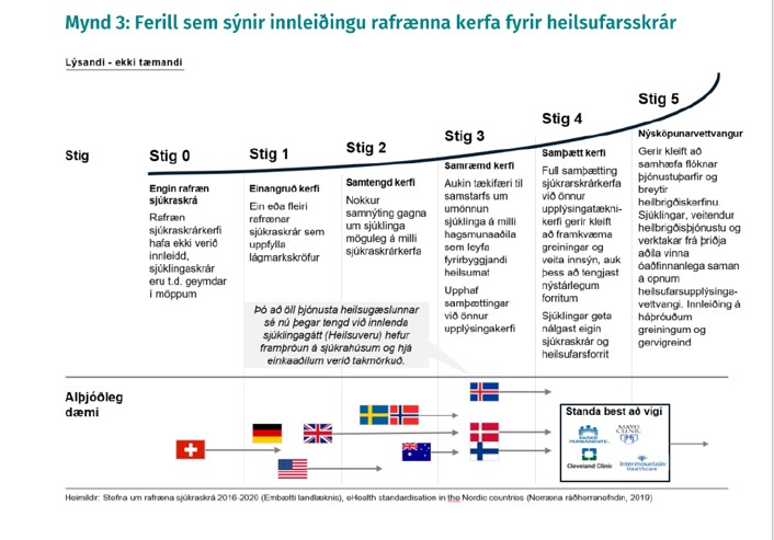 Önnur leið til að bæta framleiðni er að tryggja að ferlar, ekki síst rafrænir ferlar, séu sem skilvirkastir. Þar hefur töluverð vinna verið í gangi undanfarinn áratug, ekki síst í þróun rafrænna kerfa fyrir heilsufarsskrár. Þótt við séum ekki fremst í flokki á Norðurlöndum fer því fjarri í samanburði á milli landa að Ísland og sjúkrahúsin séu þar eftirbátar annarra þjóða, eins og sést vel á mynd 3 úr skýrslu McKinsey.