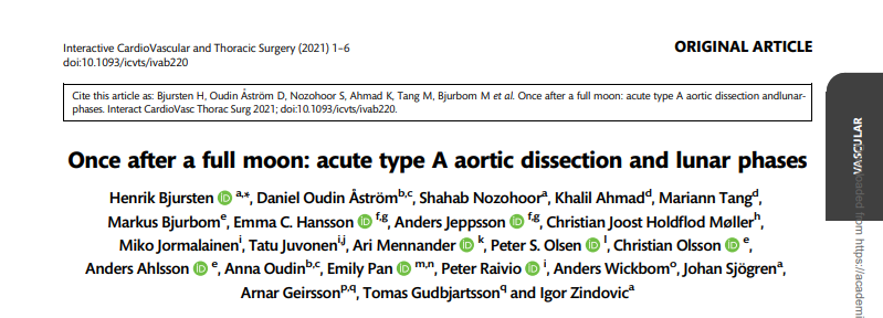 Í ljós hefur komið að tíðni skurðaðgerða við lífshættulegri flysjun í brjóstholshluta ósæðar var marktækt meiri fyrstu dagana eftir fullt tungl. Aukningin var þó tiltölulega lítil og orsakasambandið ekki augljóst og því talin þörf á frekari rannsóknum á viðfangsefninu. Í Interactive CardioVascular and Thoracic Surgery hefur verið birt vísindagrein um þetta sem íslenskir hjartaskurðlæknar komu að í samstarfi við 20 aðra kollega á 7 öðrum háskólasjúkrahúsum á Norðurlöndum.