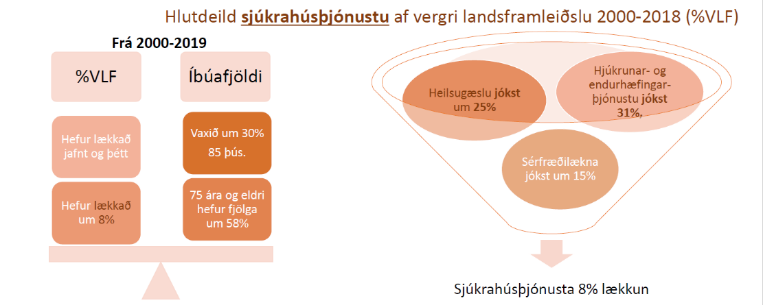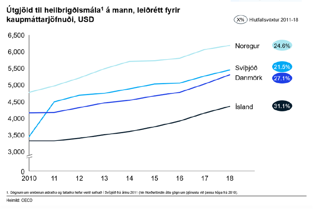 Að öskra á hvert annað hér innanhúss er óvinafagnaður en skiljanlegt þegar skortur er yfir, undir og allt um kring. Hvort sem um er að ræða það sem hátt fer í fjölmiðlum, eins og erfiðleika á bráðamóttöku, skort á gjörgæslurýmum, óviðunandi fjármögnun vísinda - eða það sem sjaldnar nær eyrum almennings en er ekki síður alvarlegt, eins og skortur á fagfólki og sívaxandi verkefni. - Hvert sem litið er í þeim áskorunum sem við er að glíma þá er svarið þegar orsökin er greind langvarandi skortur á fjármagni. Þegar litið er á samanburð þá sést að Ísland ver miklu minna fjármagni til heilbrigðisþjónustu en nágrannalöndin og erum ekki að fara að ná þeirri fjármögnun sem þar er talin nauðsynleg á næstu árum að óbreyttu, þrátt fyrir að gefið hafi verið í (sjá mynd fyrir neðan).