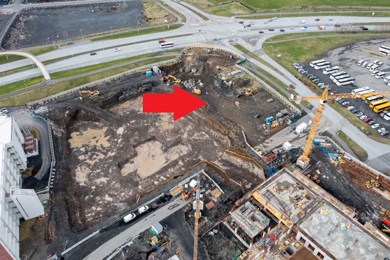 Rauða örin á myndinni fyrir neðan vísar á hvar nýja bílastæða- og tæknihúsið á að rísa.