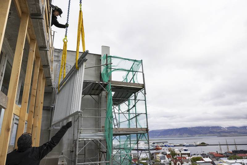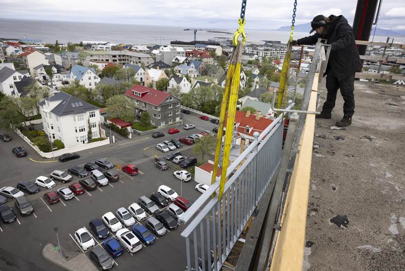 Handriðin voru hífð á sinn stað 24. maí 2022 og meðfylgjandi myndir voru teknar þá. Þetta er í reynd síðasti áfangi í endurgerð handriða á Landakoti, þau hafa verið tekin niður, sandblásin og endursmíðuð að hluta til að mæta kröfum byggingareglugerðar varðandi hæð þeirra og síðan send norður í land í galvanhúðun. Handriðið á 8. hæð er stærst og efnismest og setur mikinn svip á turninn. Það var smíðað árið 1962 og hefur því enst vel.