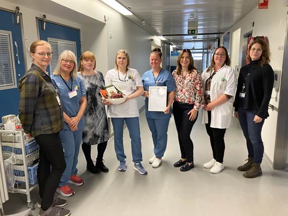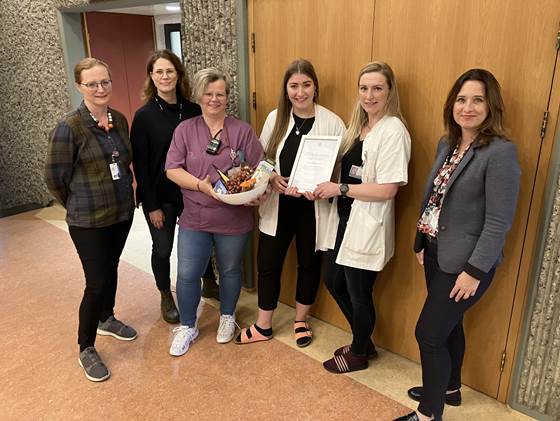 Neðri myndin sýnir Steinunni Örnu Þorsteinsdóttur, deildarstjóra heila-, tauga- og bæklunarskurðdeildar B6, taka á móti viðurkenningunni ásamt Laufeyju Vilmundardóttur sjúkraliða, Rögnu Nikulínu Magnadóttur sjúkraliða, Jóhönnu Kristínu Jóhannesdóttur sjúkraliða og Bryndísi Bjarnadóttur hjúkrunarfræðingi.