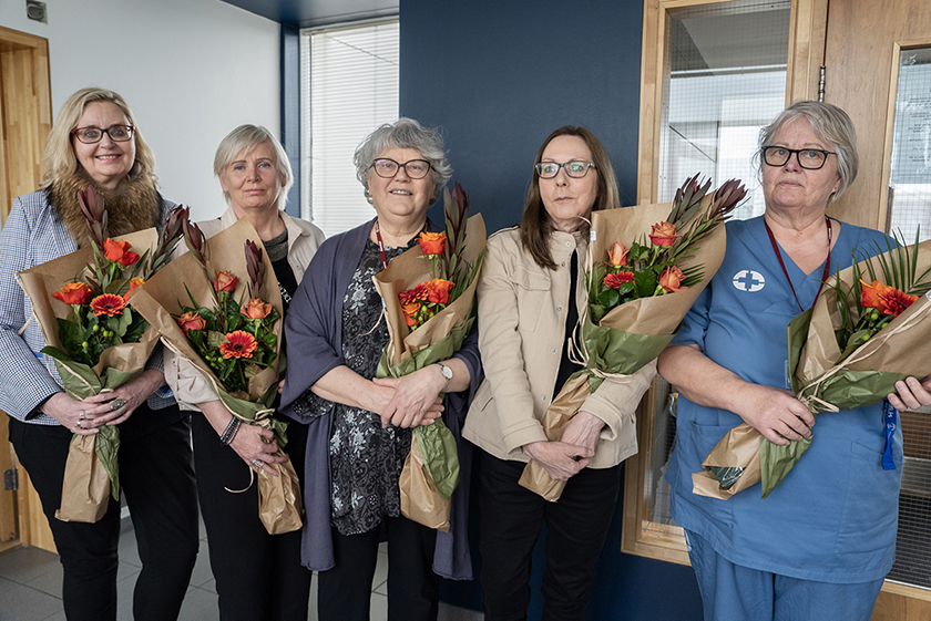 Í tilefni dagsins voru starfsmenn heiðraðir sem lengst hafa starfað á Líknardeild. Frá vinstri: Guðlaug Helga Ásgeirsdóttir sjúkraprestur, Brynhildur Baldursdóttir sjúkraliði, Valgerður Sigurðardóttir, fyrrum yfirlæknir, Ásta Óladóttir sjúkraliði og Sigríður Jónsdóttir sjúkraliði.
