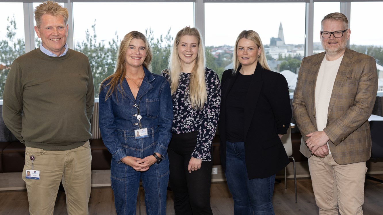 Á myndinni má sjá Má Kristjánsson framkvæmdastjóra bráða-, lyflækninga- og endurhæfingarþjónustu, Ómar Örn Jónsson Framkvæmdastjóra Velferðar og ráðgjafar hjá ÖMÍ, Diljá Guðmundsdóttur sérfræðing í heilbrigðistækni hjá ÖMI, Önnu Maríu Sighvatsdóttur sérfræðing í heilbrigðistækni hjá ÖMI og Signýju Jónu Hreinsdóttur verkefnastjóra á Verkefnastofu Landspítala. Á myndina vantar: Sigríði Erlu Sigurðardóttur og Hrönn Árnadóttur, hjúkrunarfræðing í Lungnaheimateymi.