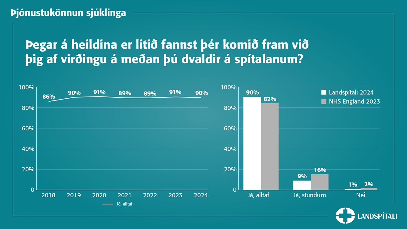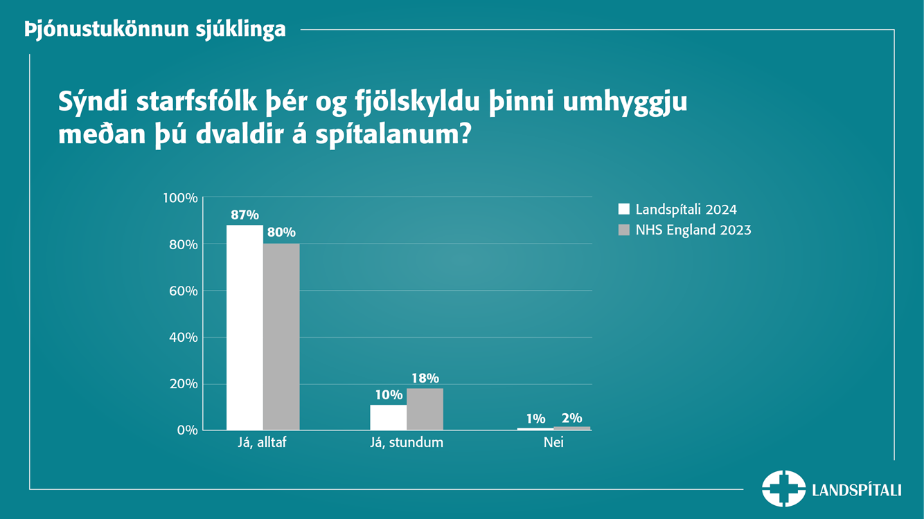 Aðeins 1% sjúklinga segjast ekki hafa upplifað umhyggju af hálfu starfsfólks. Tæp 90% segjast hafa upplifað umhyggju starfsfólks alla spítaladvölina. Markmið okkar er að það hlutfall sé 100%!