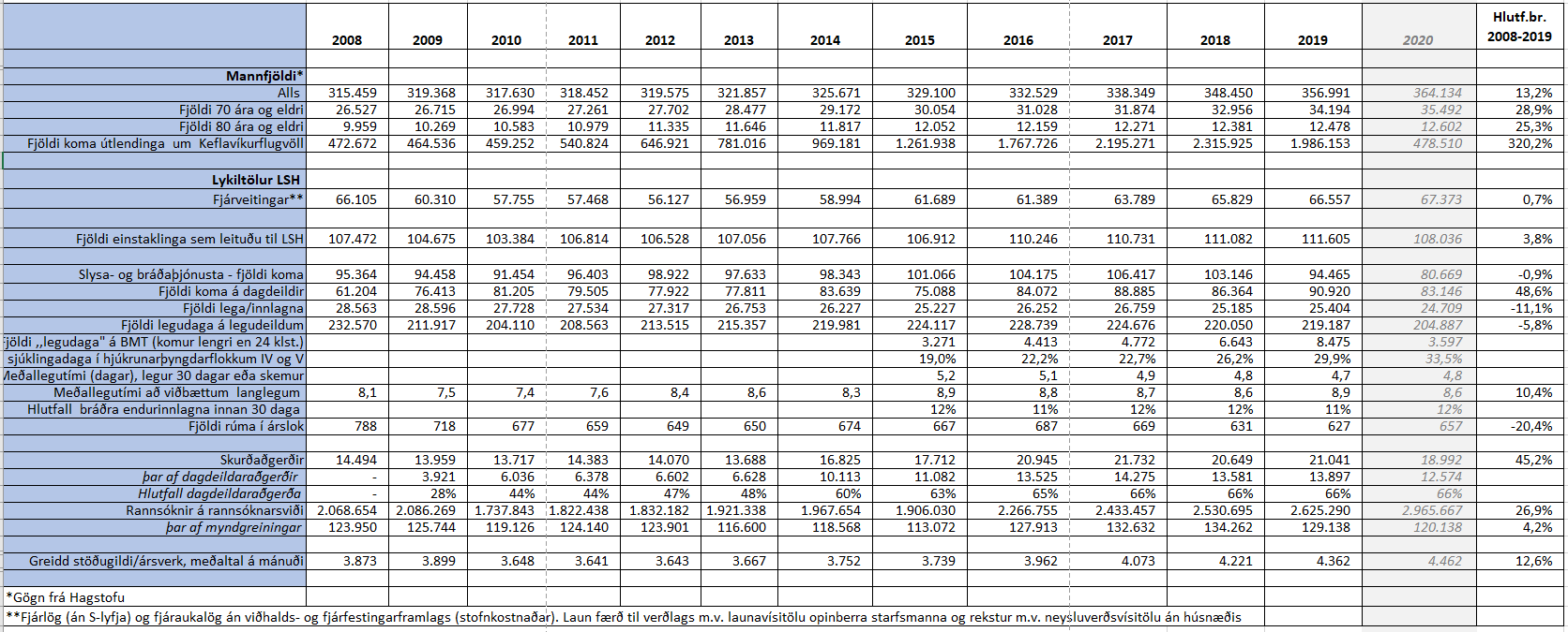 Einstaklingum sem leituðu til spítalans á þessu tímabili fjölgaði úr 107.472 í 111.605 eða um 3,8%. Fjöldi koma á slysa- og bráðmóttöku stóð nánast í stað, þær dragast saman um 0,9%. Í ljósi aukinnar þjónustu á dagdeildum þá drógust komur á göngudeildir umtalsvert saman eða um 19%. Komum á dagdeildir fjölgaði um 48,5%, úr 61.204 komum árið 2008 í 90.920 árið 2019.