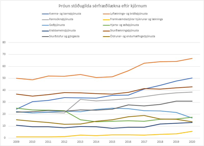 Framleiðni hefur hins vegar dregist saman frá árinu 2015 og er meginskýringin á því tímamótakjarasamningur við lækna sem tryggði þeim mikilvæga hvíld í kjölfar erfiðra vakta. Til að manna nokkuð sambærilega starfsemi hefur stöðugildum sérfræðilækna fjölgað um 50 og er það vel.