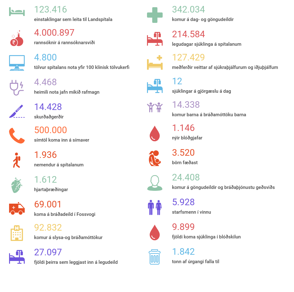Á Landspítala er mjög öflug starfsemi á fjölmörgum sviðum. Hér er t.d. einföld mynd í tölum af því sem gert var árið 2021: