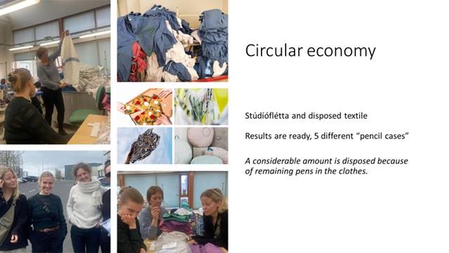1. Stúdíóflétta https://www.studiofletta.is/ hafa með styrk frá Hönnunarsjóði og nýsköpunarsjóði námsmanna greint tækifæri og gert tillögu að fimm gerðum að svokölluðum „pennaveskjum“. Hluti textílsins eru ný föt en pennar hafa þvælst með í þvott og skemmt efnin. Hönnunarteymið hefur hannað tískutöskur, innkaupapoka ofl. með pennaslettunum til þess að minna starfsfólk á að tæma vasa en einnig til að gera verðmæti úr góðum efnum.
