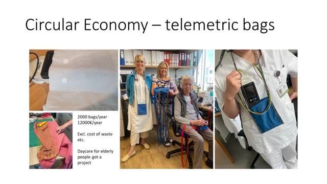 2. Sjúklingar hjartadeildar nota um 1400 einnota poka fyrir mælitæki sem kosta deildina 1.150.000 kr. - árlega. Múlabær, dagþjálfun fyrir aldraða, tók að sér að sauma margnota telemetríupoka fyrir hjartadeild. Strax kom í ljós að önnur deild getur nýtt sér þessa poka. Enn er verið að sauma. Pokarnir eru sniðnir úr ónýtum yfirbreiðslum þvottavagna og gömlum blússum starfsfólks. Þegar upp er staðið geta sparast um 1.800.000 kr/árlega og textíl er komið í umferð.