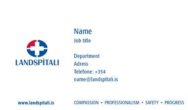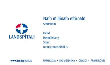 Nafnspjöld líta út eins og myndirnar sýna nema upplýsingar um starfsmanninn vantar. Þær upplýsingar þarf að setja í tölvupóstinn þegar óskað er eftir nafnspjaldi, bæði á íslensku og ensku.