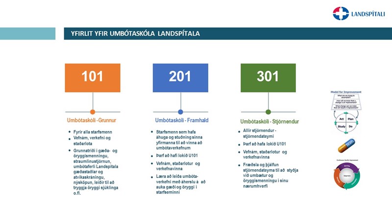 Námskeiðið varð til við sameiningu umbótaskóla 101 og 102, en umbótaþjálfun Landspítala er í stöðugri endurskoðun. Öll okkar umbótanámskeið byggja á fyrri lean námskeiðum þar sem áhersla var á að fræða starfsfólk um hugmyndafræði lean (straumlínustjórnunar).