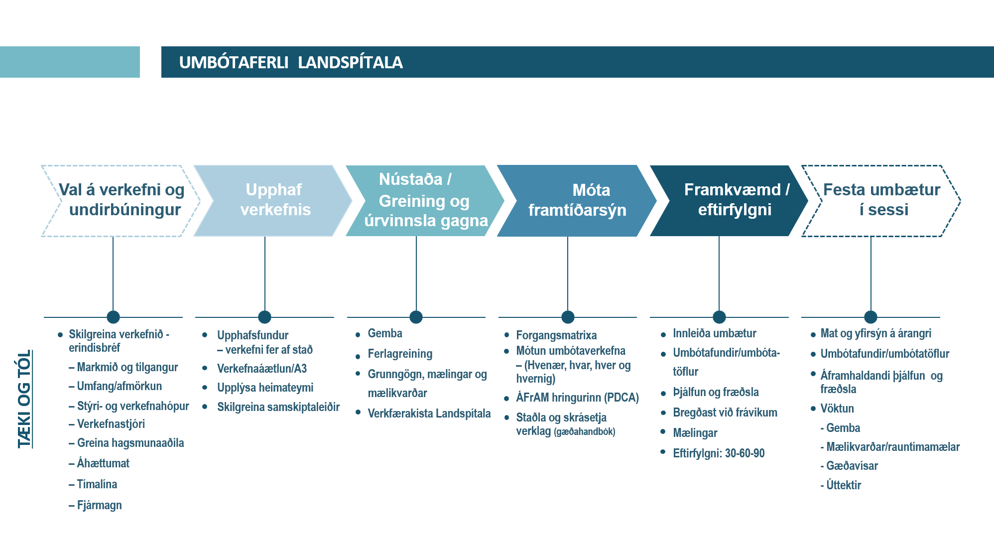Á verkefnastofu er unnið eftir stöðluðu umbótaferli þar sem ýmis tæki og tól eru notuð, sjá mynd: