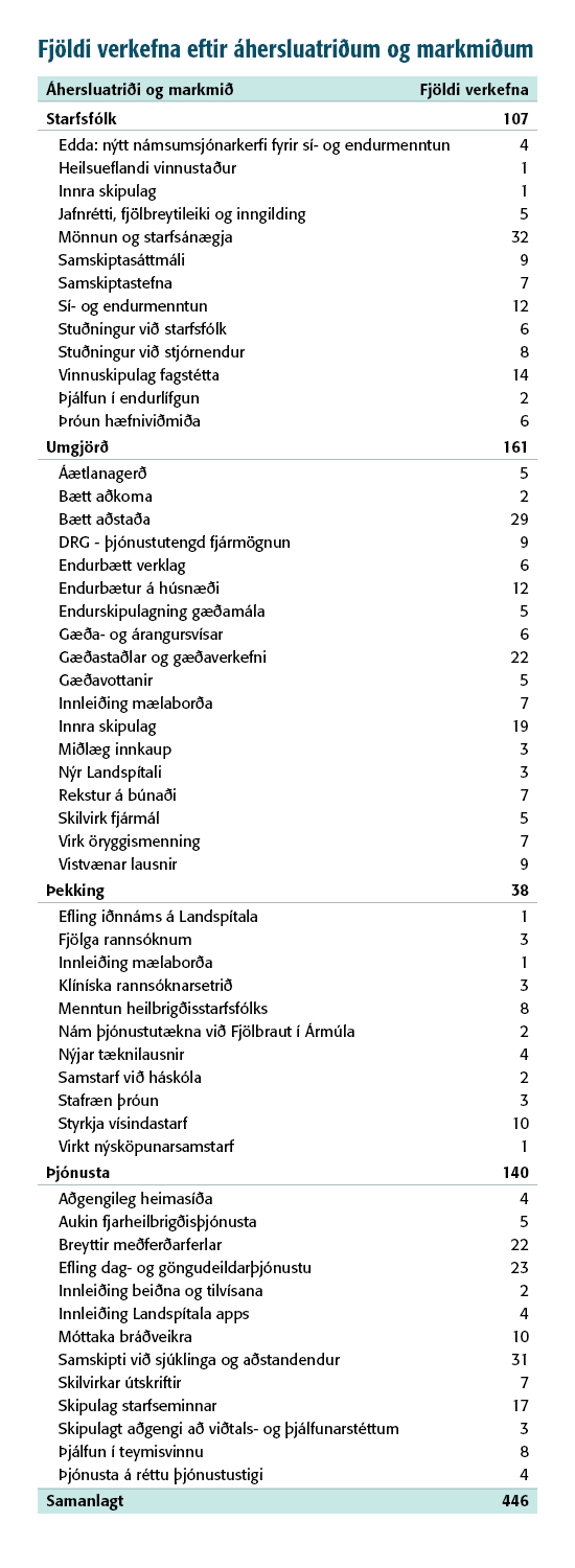 Starfsáætlun Landspítala fyrir árið 2024 er verkefnamiðuð og er unnin eftir stefnu Landspítala og áhersluatriðum hennar sem eru þjónusta, starfsfólk, þekking og umgjörð. Verkefnin eru tæplega 450 talsins og miða að ríflega fimmtíu markmiðum í starfsemi spítalans. Öll verkefnin eru þess eðlis að þeim eigi að vera hægt að ljúka á árinu 2024 en sum þeirra eru einnig liður í langtímaverkefnum sem eru til þess fallin að bæta þjónustu spítalans, auka skilvirkni og tryggja að sjúklingar fái bestu meðferð sem völ er á.