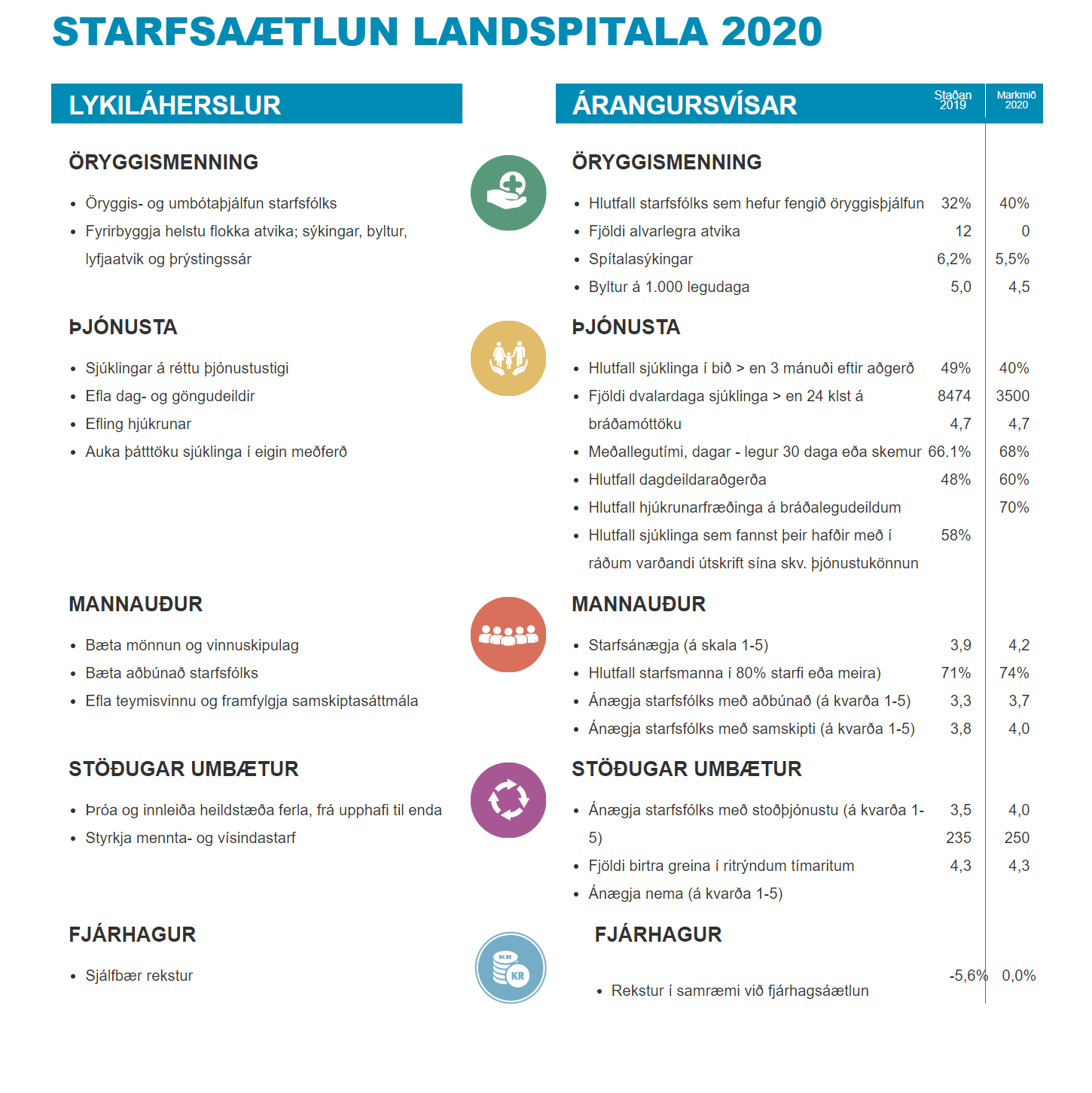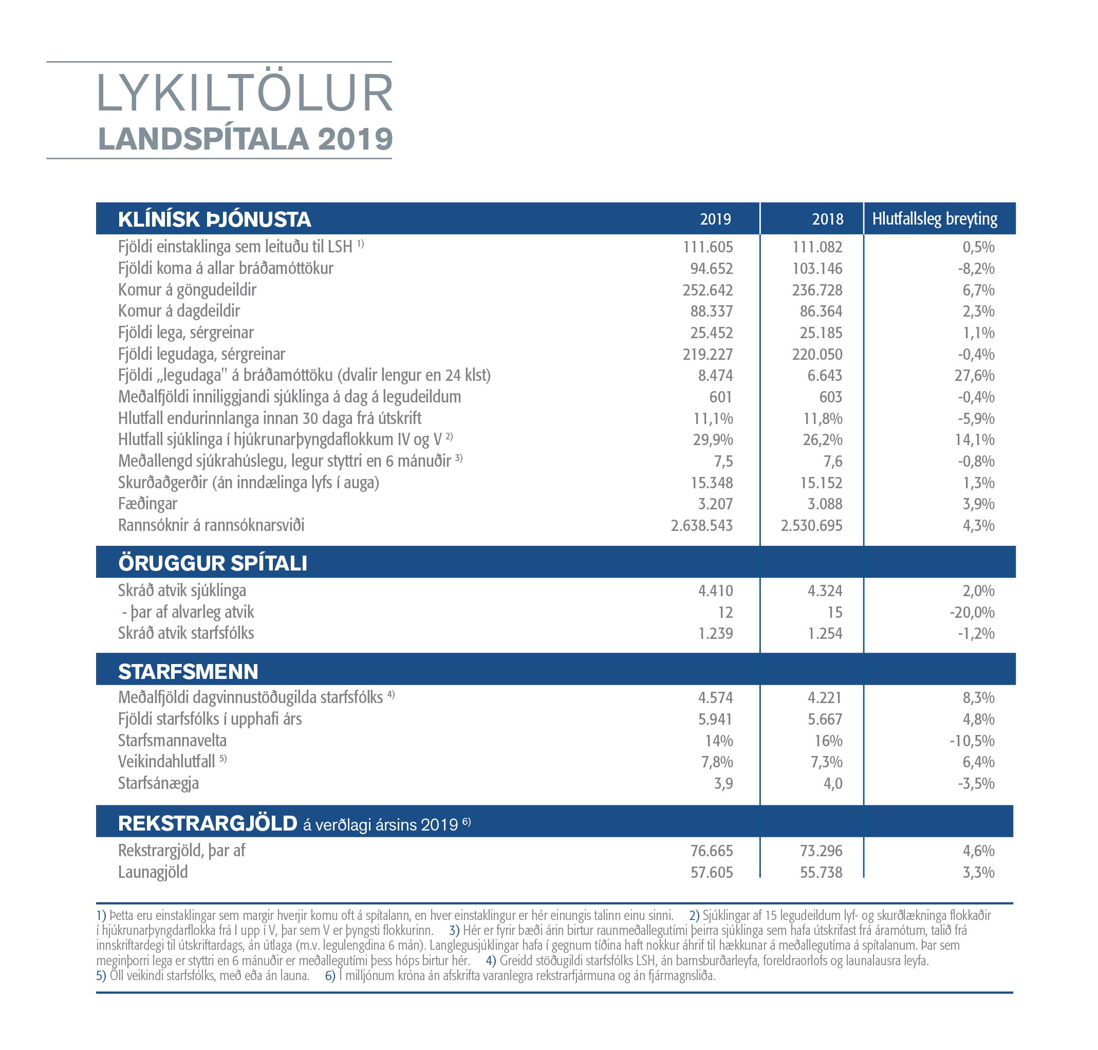 Gröf: Klínísk starfsemi - fjöldi lega/innlagna og legudaga - Fjöldi koma á göngu- og dagdeildir - Komur á bráðamóttökur - Meðallegutími (dagar) - Skurðaðgerðir, án inndælinga lyfs í auga - Fjöldi sjúklinga í bið eftir vistun utan Landspítala - Fjöldi stöðugilda og starfsmannavelta - Rekstrarkostnaður - Fjöldi alvarlegra atvika - Fjöldi rúma í árslok - Fæðingar - Rannsóknir rannsóknaþjónustu - Mannauður - Starfsánægja stafsmanna - Fjöldi nemenda á Landspítala.